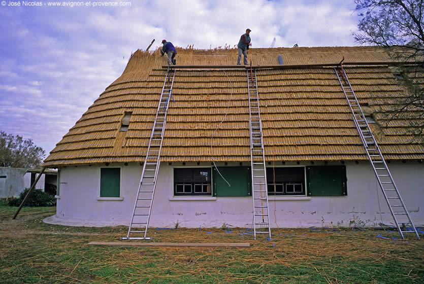 La toiture est faite de roseaux (la sagno, reportage sur la Sagne en Camargue), matériau bon marché que l'on trouve à profusion dans les régions marécageuses. Ils sont cousus au fil de fer sur la charpente.