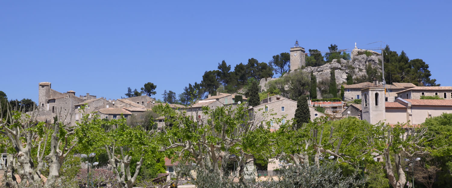 You can leave your vehicle at the bottom of the village, next to the new Saint-Laurent Church, built in 1905 in Romanesque Revival style. From there, a street leads past beautiful houses with carved doors – here, there are no pastel tones, everything is of limestone rock, in the image itself of the Alpilles. After a bit of easy walking, you're at the top.