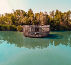 On the shores of a magnificent lake in the heart of the Châteauneuf-du-Pape vineyards, come and discover our 20 floating cabins, built on stilts, covered in vegetation and 100% self-sufficient!