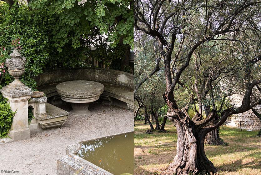 Une mosaïque de massifs, parterres et terrasses, les jardins sont aménagés dans les styles toscan de la Renaissance, méditerranéen et provençal. Rosiers, glycines, oliviers et pins centenaires, plantes fleuries, bref plus de 100 espèces s’entremêlent entre les vestiges et tombeaux de l'ancienne abbaye. Vases, bassins, sculptures et une belle pergola ornent les allées où il fait bon flâner et respirer les parfums.