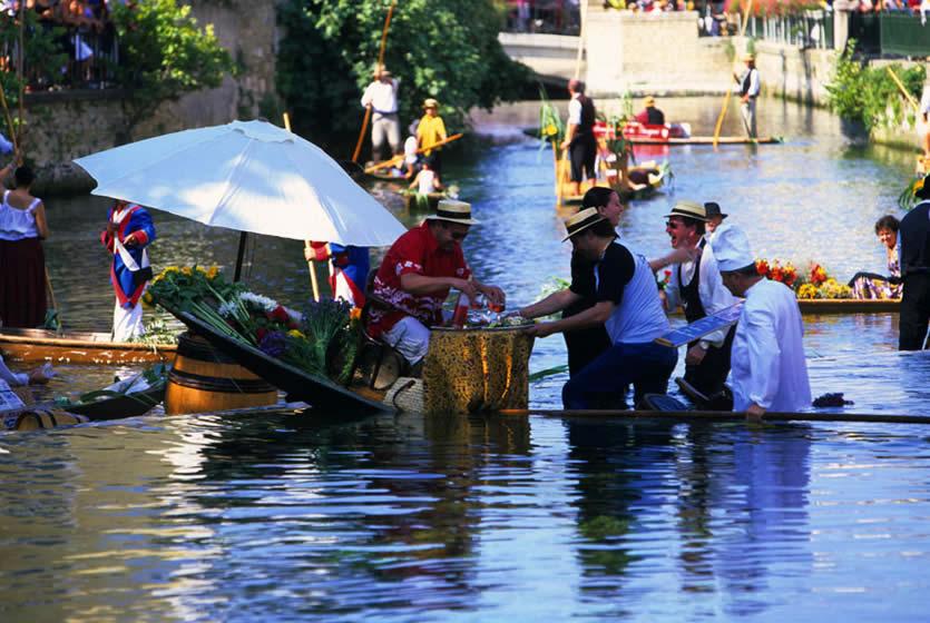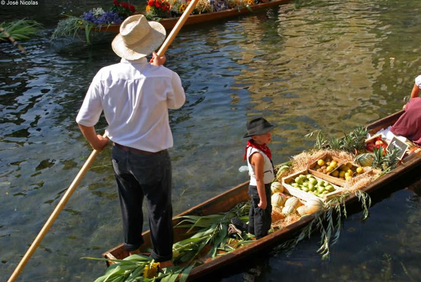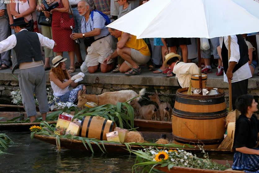 Les "nego chins", barques typiques de l'Isle sur la Sorgue, glissent d’une rive à l’autre à l’appel du public, et offrent à leurs yeux une farandole de couleurs et de senteurs (productions locales telles que fruits et légumes, bouquets de fleurs, fromage, vin, pain..). On peut ainsi faire son marché et profiter, en plus, des costumes provençaux traditionnels, de la musique et du commentaire vivant et chantant… Mais pour cela, il faut arriver tôt car l’accès est très difficile !